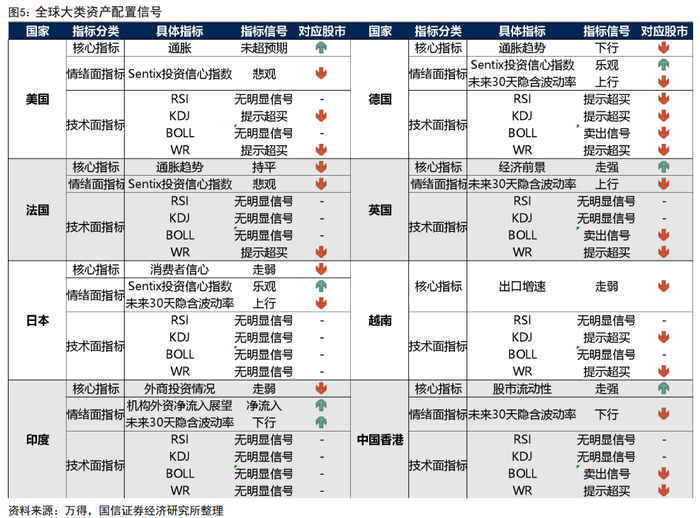 根据我们的全球资产配置模型(详见2024年4月24日外发报告《全球资产配置启航》),模型显示2025年4月份A股之外全球主要股市的配置比例为:美国(15.38%)、德国(0.96%)、法国(0.00%)、英国(15.38%)、日本(0.96%)、越南(0.00%)、印度(1.92%)、中国香港(15.38%)。余下50%比例按模型假设配置无风险收益产品。