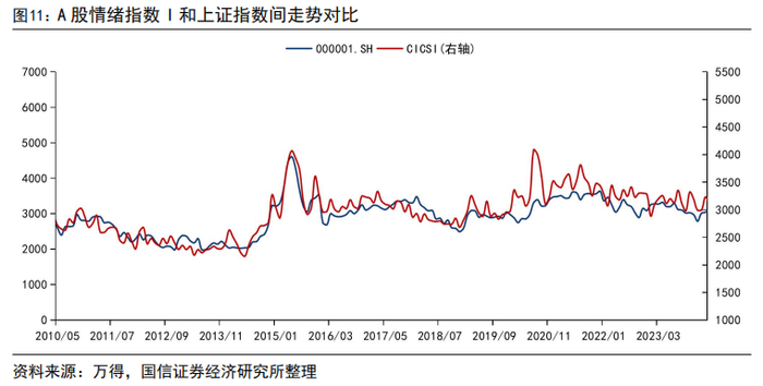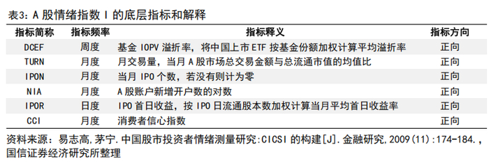 我们采用六类底层指标构造A股情绪指数I,这些指标包括基金溢价率、股市交易量和开户数、IPO数量及首日收益率、经济基本面信心等多个维度: