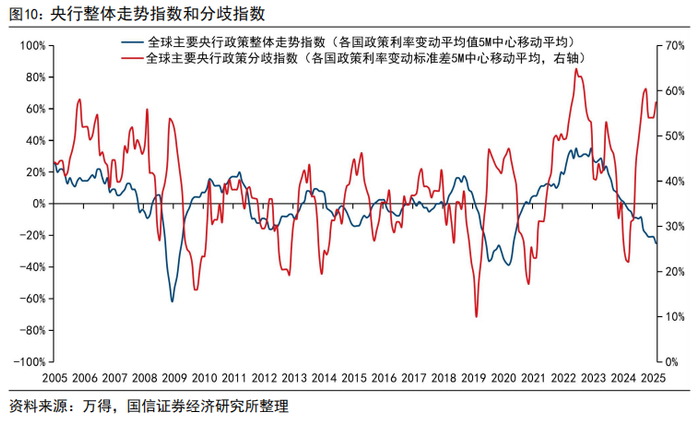 央行分歧指数是用来衡量世界各大经济体央行货币政策分歧程度的一个指标。它对各国央行政策利率的变化方向进行统计分析,能够反映出不同国家央行在国内外部门经济形势和通货膨胀压力等方面的差异性,也可以帮助投资者预判未来各国央行货币政策分歧程度及其变化方向。3月全球央行整体走势指数下行,政策分歧指数上行,表示全球央行降息进度有所分化,分歧增大。