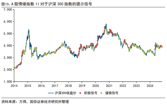 根据中国A股市场特点,我们使用一级行业的相对于股票宽基指数(此处以沪深300为例,同步跟踪万得全A和上证指数)的周Beta系数和周收益率等基础数据,可以构建适合国内语境的投资者情绪指数,该指数在历史上基本可以提示了沪深300指数的运行趋势、底部空间和风险位置。3月情绪指数Ⅱ2次发出谨慎信号,提示近期股市情绪有所降温。
