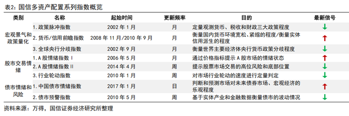 本报告对过往研究阶段中编制的多资产配置相关的指数进行了汇总发布,其中包括宏观景气和政策量化指数、股市交易情绪指数以及债市情绪和风险指数。这些指数是宏观经济环境和市场表现评估的重要工具,在定性分析的基础上添加完全依赖于数据刻画的宏观环境、市场情绪等维度,能够帮助投资者更好地把握市场趋势并做出合理的投资决策。基于自上而下的思维出发,对于国内外的货币、财政等政策进行量化观测,以此为基础落实到多资产配置最为重要的两个领域:A股市场和债券市场,通过成交、价格等因素对市场的风险、水位、情绪等进行刻画。三大类别、共计八个分支指数如下表所示: