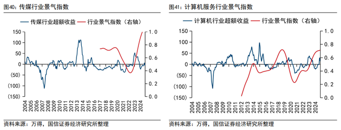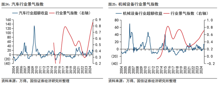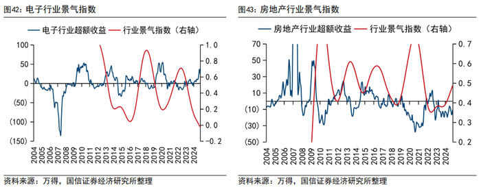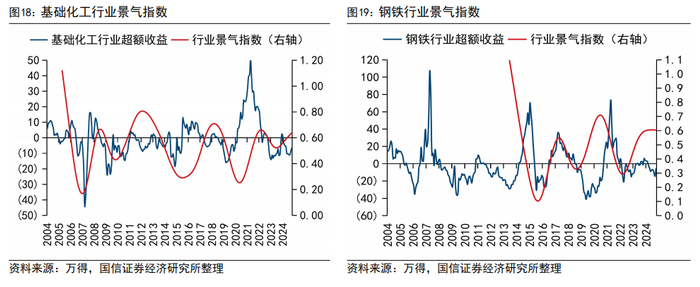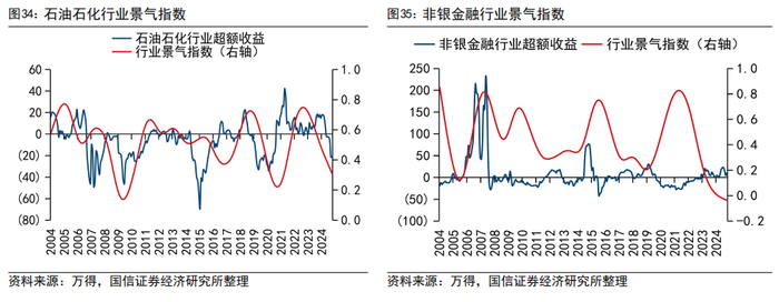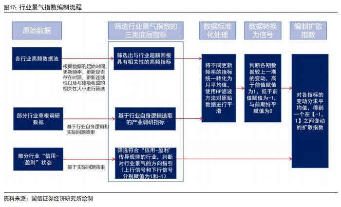我们基于三方面数据构建中观行业/板块景气指数:一是与超额回报具有相关性的高频指标,各行业具有2-6个不等的高频跟踪指标;二是基于调查获取的与行业自身逻辑高度相关的产业指标,包含总需求、海外需求、产成品存货、行业前景等;三是对于信用环境对其超额收益有指示效果的行业,额外增加行业信用环境数据。对行业/板块的各类数据进行整理后,采用扩散指数的编制方法编制行业/板块景气指数。