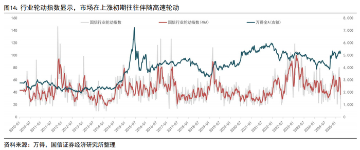 我们对各行业过去一年左右时间内的涨跌幅进行排序,根据各个行业涨跌幅排名变化构造行业轮动指数。如果每个行业涨跌幅排名当期没有发生变化,那行业轮动指数将降至0,该指数越高代表行业轮动的速度越快,越难以通过市场主线的思维捕捉。3月A股行业轮动指数有所回落。