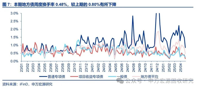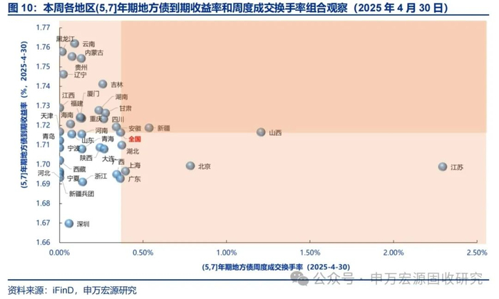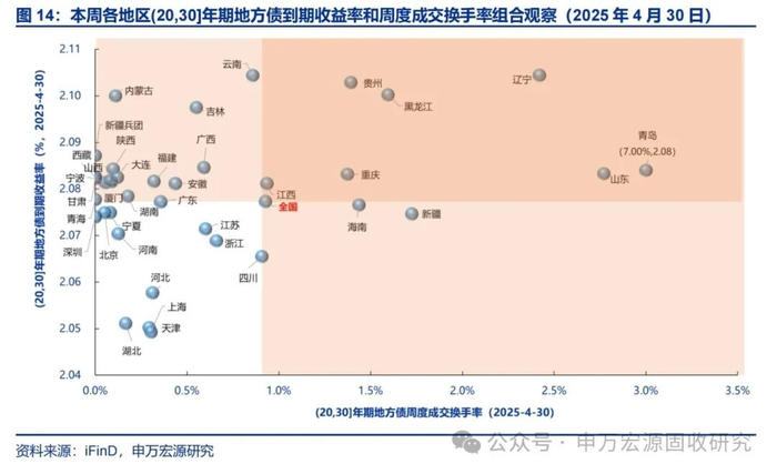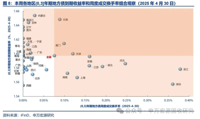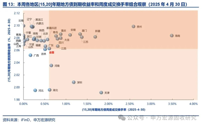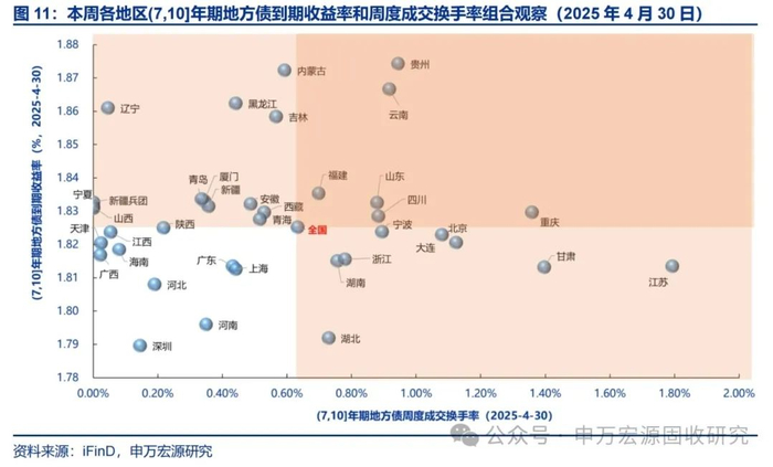 本期10年和30年地方债减国债利差表现分化,周度换手率环比下降。截至2025年4月30日,10年和30年地方债减国债利差分别为25.57BP和26.60BP,较2025年4月25日分别收窄0.37BP和走阔5.36BP(2025年4月25日分别为25.94BP和21.24BP),分别处于2023年以来历史分位数的80.0%和98.4%,仍具较高的性价比。本期地方债周度换手率为0.48%,较上期的0.80%有所下降。本期贵州、云南、福建等地区7-10Y地方债收益率和流动性皆优于全国水平。