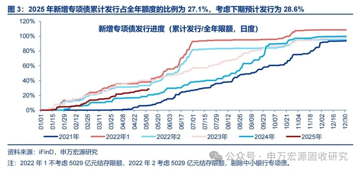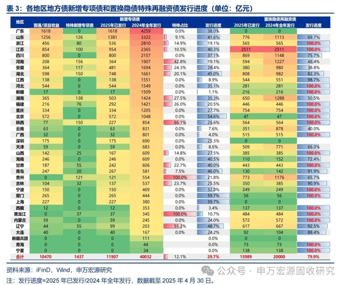 本期未发行特殊新增专项债,置换隐债特殊再融资债发行56亿元。截至2025年4月30日,特殊新增专项债累计发行1437亿元(本期发行0亿元);置换隐债特殊再融资债累计已发行15989亿元(本期发行56亿元),发行进度达79.9%,其中浙江等17个地区已全部发完(本期新增甘肃地区)。
