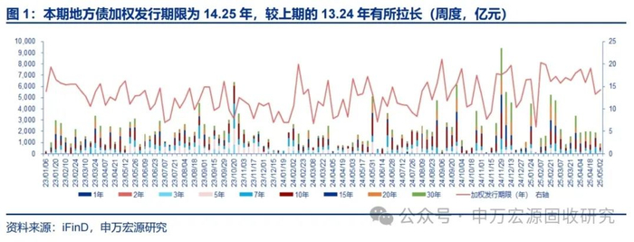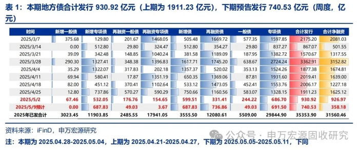 受假期因素影响,本期地方债发行和净融资环比均下行,预计下期发行和净融资环比均下行。本期(2025.04.28-2025.05.04)地方债合计发行/净融资930.92亿元/926.97亿元(上期为1911.23亿元/1625.12亿元),下期(2025.05.06-2025.05.11)预计发行/净融资740.53亿元/358.18亿元。从加权发行期限来看,本期地方债加权发行期限为14.25年,较上期(2025.04.21-2025.04.27)的13.24年有所拉长。