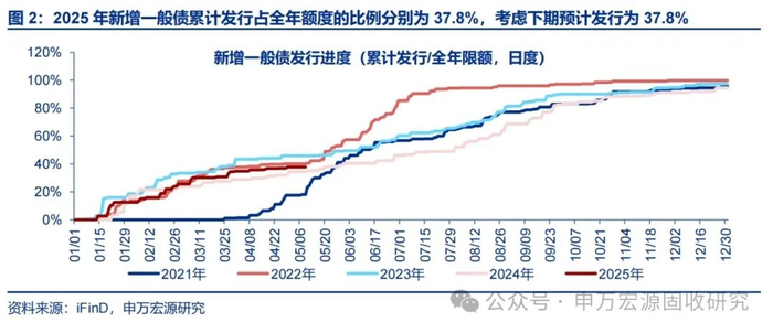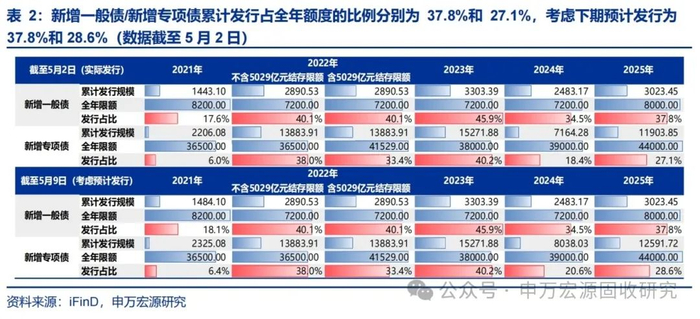 本期新增地方债发行尚未提速,累计发行进度低于2023年同期但高于2024年同期。截至2025年5月2日,新增一般债/新增专项债累计发行占全年额度的比例分别为37.8%和27.1%,考虑下期预计发行为37.8%和28.6%。2024年累计发行进度分别为34.5%/18.4%和34.5%/20.6%,2023年累计发行进度分别为45.9%/40.2%和45.9%/40.2%。