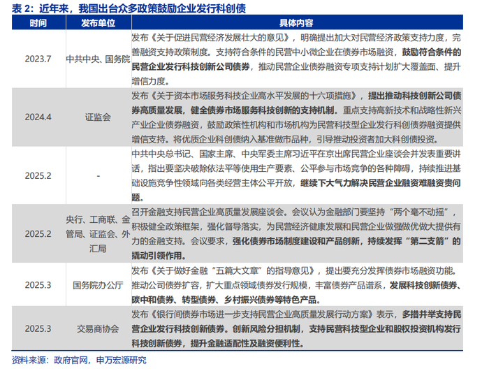 更早在2025年3月6日,十四届全国人大三次会议经济主题记者会上,央行行长潘功胜已提出,将会同证监会、科技部等部门,创新推出债券市场的“科技板”,丰富科技创新债券的产品体系,重点支持支持金融机构、成长/成熟期科技型企业、头部私募股权投资/创投机构等三类发行主体。