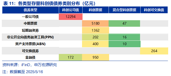 存量科创债市场的债券类别与发行情况相近。截至2025年5月16日,存续的科创债合计规模2.09万亿元,共计2053只。其中,存量科创公司债主要为一般公司债(98.6%)和金融债(证券公司债,1.4%),科创票据以中期票据(64.0%)和短期融资券(16.8%)为主,另增加11.7%的银行科创债;混合型科创票据则主要为中期票据(65.0%)和定向工具(21.6%)。其中,科创金融债(包括证券公司和银行发行的科创债)皆为2025年5月以来发行。