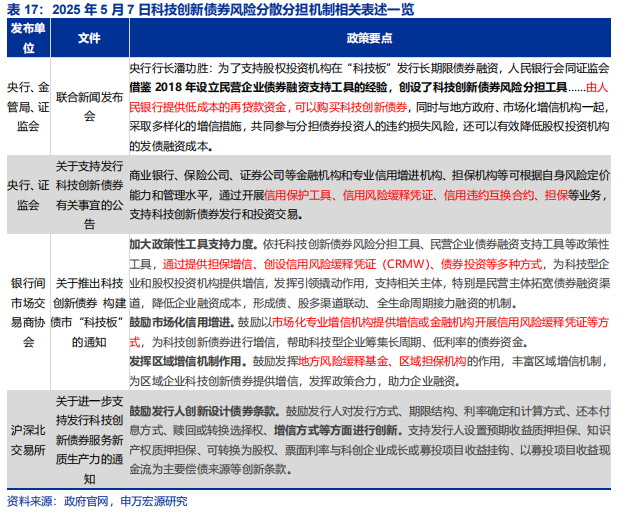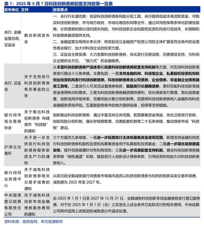 2025年5月7日,科创债迎来一系列重磅支持政策。在央行等三部委联合新闻发布会上,央行行长潘功胜明确“创设科技创新债券风险分担工具,央行提供低成本再贷款资金,可购买科技创新债券,并与地方政府、市场化增信机构等合作,通过共同担保等多样化的增信措施,分担债券的部分违约损失风险”。同时,央行、证监会正式发布债券市场科技板纲领性文件,从丰富科创债券产品体系和完善配套机制两方面,提出了十三条具体举措。此外,交易所和交易商协会分别出台文件,优化科创债在交易所和银行间的发行机制,涵盖发行主体、募资用途、信息披露、交易、增信等方面;银行间拆借中心和中央结算公司宣布全额减免科创债现券买卖交易手续费及科技创新专项金融债券的发行登记服务费,为科创债市场注入更多活力。