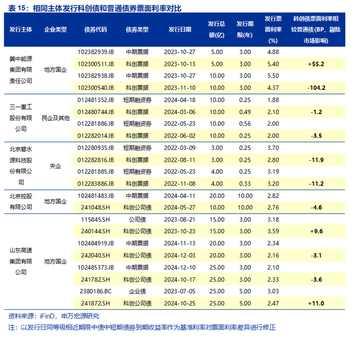 央企及地方国企为科创债的主要发行主体,由于科创公司债发行门槛相对更高,发行人整体评级资质优于科创票据。从发行主体的企业类型来看,科创公司债的主要发行人为央企及地方国企,2024年两者发行规模合计占比为97.6%,科创票据的主要发行人同样为央企及地方国企,但相较科创公司债而言民企占比更高,2024年央企/地方国企/民企发行规模占比分别为40.6%/43.6%/15.8%;从发行主体的隐含评级来看,科创公司债整体资质明显强于科创票据,科创公司债以AAA系列为主,2024年发行占比54.7%,AA+级占比29.8%,而科创票据隐含评级以AA+级、AA级为主,两者占比为76.5%,AAA系列占比仅为17.6%,但科创公司债和科创票据弱资质主体(隐含评级AA-及以下)占比均较低,分别为1.4%和4.8%。