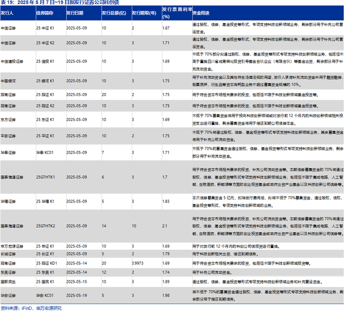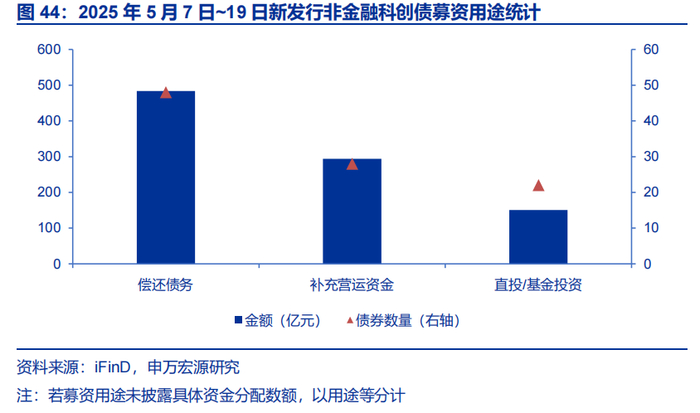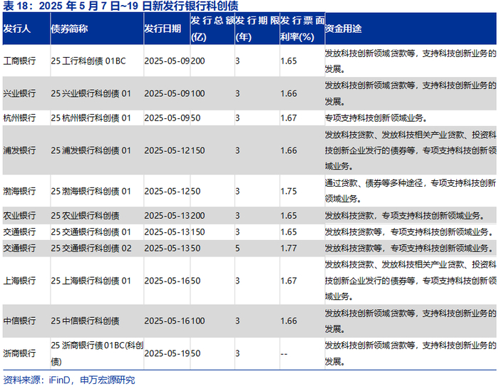 “科技板”出台首周债券发行表现如何?5月6日~5月19日,已有89家主体公告发行107只科创债,总规模突破2100亿元。其中,11家银行合计发行1150亿元、占比超五成,18家证券公司合计发行184亿元。从募资用途来看,银行科创债主要用于发放科技创新领域贷款,证券公司科创债通过股权、债券、基金投资等形式专项支持科技创新领域业务,而非金融科创债则以偿还债务为主,占比达52.1%。