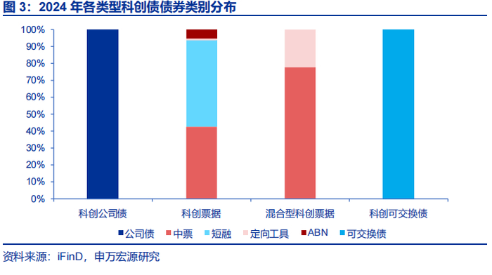 科创债在债券类别上较为多样。从2024年发行情况来看,科创公司债全部为公司债,为企业提供长期稳定的资金支持;科创票据则以短期融资券(51%)和中期票据(43%)为主,辅以少量的资产支持票据(ABN,5%);混合型科创票据则主要为中期票据(78%)和定向工具(22%);科创可交换债则聚焦于可交换债这一创新品种。