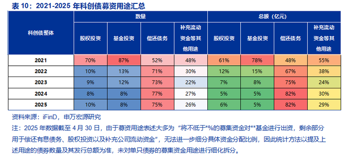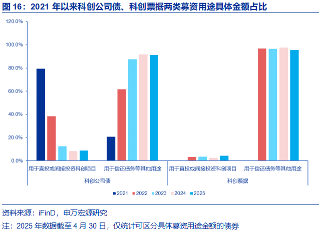 从募资用途来看,近年来科创债的科创属性有所弱化。科创债资金投向中,用于直接或间接投资科创项目的资金占比降低,而用于偿还债务等其他用途的资金占比上升,发行门槛或有所放宽。科创公司债相较于科创票据保持了更强的科创属性,可区分募资用途的债券中,2024年科创公司债用于投资科创项目的资金占比为8.2%,而科创票据则仅为2.4%。