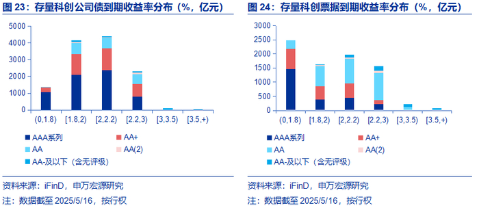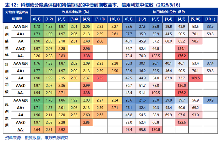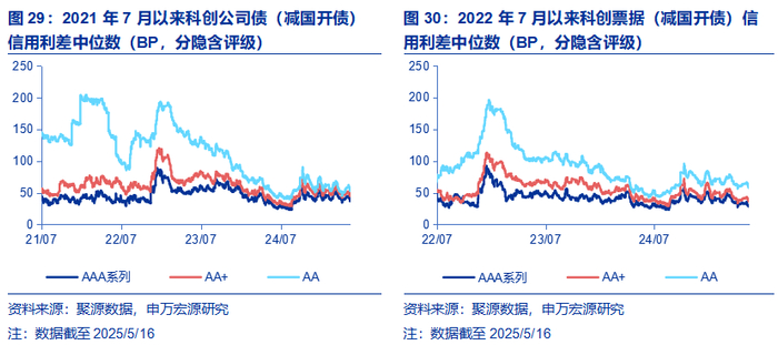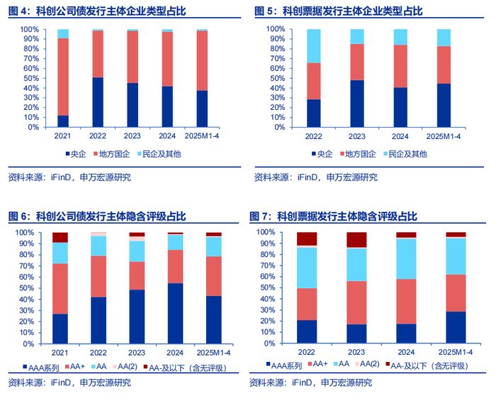 截至2025年5月16日,存续的科创债中,产业、城投、金融债规模占比分别为85.3%、9.3%、5.4%。从地区分布来看,山东、四川和湖北位列存量城投类科创债规模的前三大地区,北京、上海、广东位列存量产业类科创债规模的前三大地区,从行业分布来看,交运、综合和建筑装饰位居存量城投类科创债规模的前三位,建筑装饰、综合和公用事业位居存量产业类科创债规模的前三位。从企业类型来看,央企和地方国企仍是存量科创债主力军,分别占比40.5%和53.6%。从隐含评级来看,AAA系列、AA+、AA分别占比37.3%、24.8%、22.8%,合计85.0%,发行主体整体资质较高。