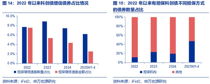 科创债整体增信比例较低,且近年来增信比例呈现逐渐降低趋势。从增信方式来看,科创公司债主要依赖担保进行增信,而科创票据拥有更为丰富的增信手段,除担保外,还采用了其他增信方式(可分为内部和外部增信,内部增信包括优先级次级结构、超额现金流覆盖、储备账户设置、信用触发机制、债权赎回/回售机制、资产回购机制等,外部增信则包括差额支付和流动性支持)。从新发行债券的增信比例来看,2025年(截至4月30日)增信科创债数量占比为6.2%、金额占比为2.5%,均较2024年有所下降,科创债的市场认可度正在提升。此外,在有担保的科创债中,专门担保机构(如融资担保/信用增进机构)的担保比例有所上升。