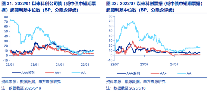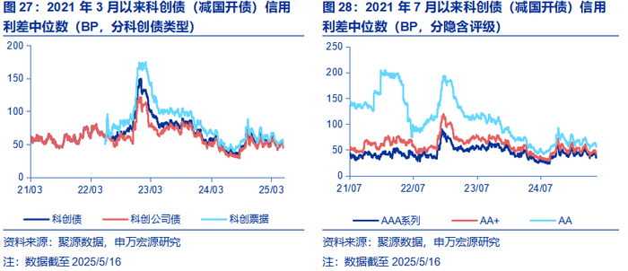 与信用债整体行情类似,当前科创债信用利差整体处于历史较低水平。从信用利差(减同期限国开债)来看,科创公司债与科创票据的信用利差走势相近,但由于科创票据整体主体资质较弱、信用风险更高,因此其信用利差整体略高于科创公司债。近年来,在资产荒持续演绎的背景下,科创债信用利差整体呈现压缩趋势,截至2025年5月16日,科创债整体信用利差已收窄至历史23.0%分位数水平(2021年3月1日有数据以来,下同),科创公司债、科创票据则分别位于26.3%、19.6%分位数水平。