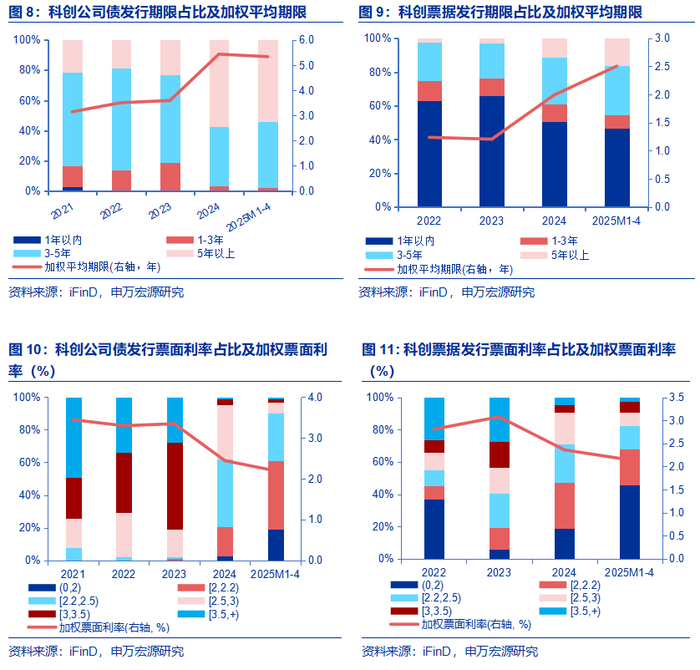 科创公司债发行期限明显长于科创票据,叠加更高的主体资质,使二者加权票面利率趋于相近。从发行期限来看,科创公司债发行期限主要集中于5年以上,科创票据则集中于1年以内(2024年占比超50%),2024年加权平均发行期限分别为5.4年和2.0年,整体发行期限在逐步拉长。从发行票面利率来看,由于科创公司债发行人资质优于科创票据,而发行期限又长于科创票据,因此二者加权票面利率相近,2024年分别为2.44%和2.36%,具体而言,2024年科创公司债发行票面利率主要集中于[2.2%,3%)区间,占比为74.88%,科创票据票面利率则较为分散,[0%,2%)、[2%,2.2%)、[2.2%,2.5%)、[2.5%,3%)区间发行规模占比分别为18.89%、28.39%、23.83%、19.54%。