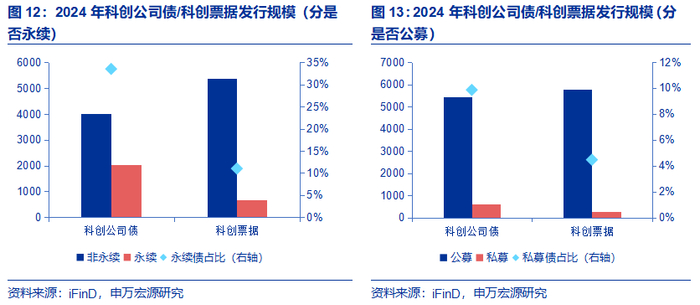 从发行方式来看,由于科创公司债发行人资质较高、市场认可度也更高,永续债/私募债占比均高于科创票据。2024年发行的科创公司债、科创票据中永续债占比分别为33.52%、11.01%,私募债占比分别为9.86%、4.47%。