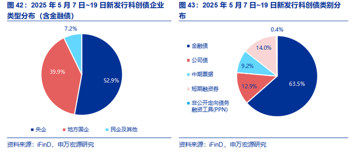 “科技板”自5月7日正式推出以来,市场反应积极,进展迅速。截至5月19日,已有89家主体公告发行107只科创债,总规模达2101.5亿元。其中,银行发行的金融科创债成为主力,11家银行合计发行1150亿元,占比超过五成,新增证券公司作为科创债发行主体,18家证券公司合计发行184亿元。从发行主体企业类型来看,央企和地方国企仍占据主导地位,分别占比52.9%和39.9%;若剔除金融债发行主体,民企及其他类型主体的占比提升至12.0%。在募资用途方面,银行发行的科创债主要用于发放科技创新领域贷款,证券公司发行的科创债主要通过股权、债券、基金投资等形式专项支持科技创新领域业务,而非金融科创债的募资用途则以偿还债务为主,占比达52.1%,补充营运资金和直接投资/基金投资则分别占比31.7%和16.2%。