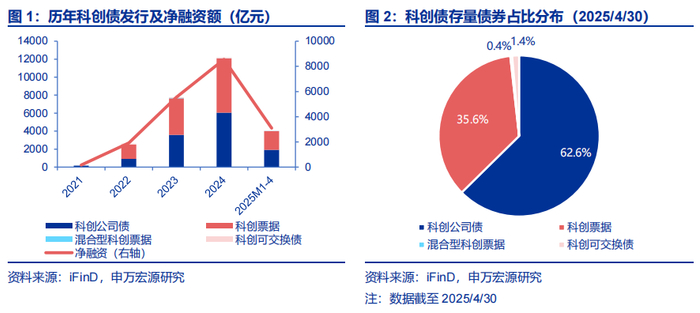 自2022年科创公司债和科创票据落地起,科创债迅速扩容。2022-2024年科创债发行额分别为2609、7768、12197亿元,净融资额分别达到1920、5552、8554亿元,截至2025年4月30日,科创债累计发行数量达2760只,累计发行规模达2.67万亿元。从产品结构来看,科创公司债和科创票据构成市场两大核心品种,截至2025年4月30日的存量科创债中,两大品种分别占比62.6%、35.6%。接下来我们将从一级发行、存量分布、二级估值、市场流动性等维度,对两大主流科创债品种展开分析。
