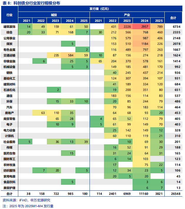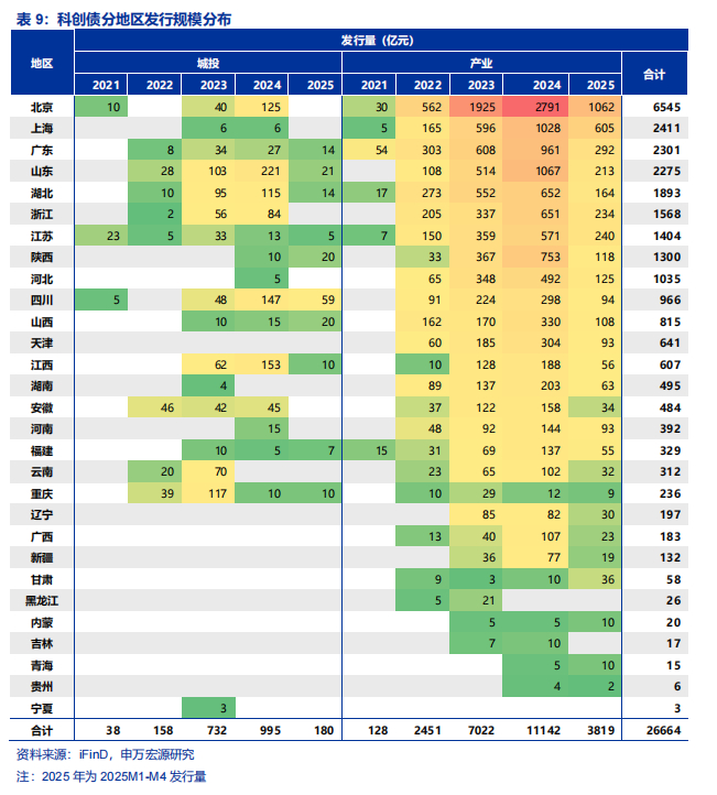 由于科创债主要定位于支持科技创新领域的实体经济发展,其发行主体集中于产业类企业。截至2025年4月30日,累计发行的科创债中,产业债占比92.14%,城投债仅占7.86%。分行业来看,传统行业在绿色转型和智慧化升级中迎来新一轮融资需求,产业债发行规模前3分别为建筑装饰、公用事业、煤炭,城投债发行规模前3分别为交通运输、建筑装饰、综合;分地区来看,产业债发行规模前3分别为北京、上海、广东三个科技创新高地,城投债发行规模前3分别为山东、四川、湖北,这些地区通过发行科创债支持区域科技创新和产业转型,推动地方经济发展。
