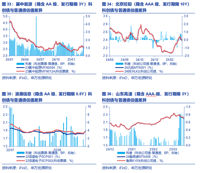 对同一主体而言,科创债与普通债估值走势基本一致,科创债或存在小幅溢价(可能就在2BP以内,但并不明显。选取冀中能源(隐含评级AA、3Y、煤炭行业)、北京控股(隐含评级AAA、10Y、公用事业)、浪潮信息(隐含评级AA、0.5Y、计算机)、山东高速(隐含评级AAA-、3Y、交通运输)四家主体发行的可比科创债和普通债的中债估值进行对比,发现二者估值走势基本一致,但科创债相较于普通债可能存在小幅溢价(大多科创债的中债到期收益率更高)。其中,北京控股、山东高速超额利差分别在-1.12BP~1.88BP、0~0.83BP区间,而资质稍弱的冀中能源、浪潮信息超额利差分别在0.02BP~17.25BP、0.12BP~18.78BP区间。市场对科创债的定价与其普通债券相近,但对低信用等级主体的科创债可能会要求更高的风险补偿。