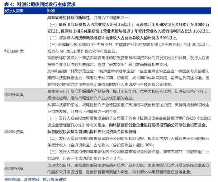 发行主体:发行人申请发行科技创新公司债券并在交易所所上市或者挂牌的,应当公司治理规范,诚信档案无不良记录,最近一期末资产负债率原则上不高于80%,支持科创企业类、科创升级类、科创投资类和科创孵化类四类发行人,涵盖了从孵化类“播种”、到中小科创类以及亟需产业升级的大型成熟企业。