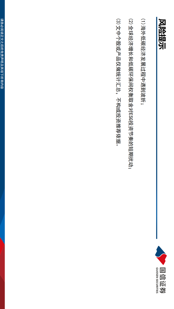 风险提示:(1)海外低碳经济发展过程中遇到波折;(2)全球经济增长和低碳环保间权衡取舍对ESG投资节奏的短期扰动;(3)文中个股或产品仅做统计汇总,不构成投资推荐依据。