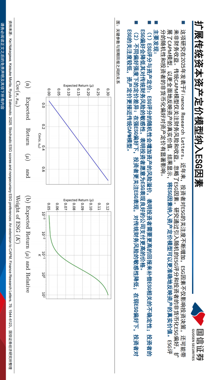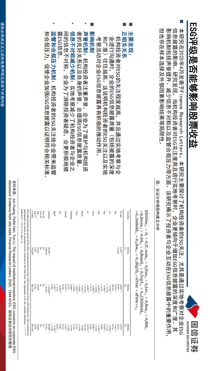 学术前沿:在2025年发表于《Finance Research Letters》的研究《Stochastic ESG scores and nonpecuniary ESG preferences: An extension to CAPM》通过引入随机的ESG评分和投资者的非货币化ESG偏好,扩展了CAPM模型,结果显示,将ESG因素纳入资产定价模型可以更准确地反映资产的真实价值,ESG评分的随机性和投资者的非货币化偏好对资产定价有显著影响;在2025年发表于《Journal of Corporate Finance》的研究《Drawing up the bill: Are ESG ratings related to stock returns around the world?》制作并使用大型全球数据库、多个 ESG 评级和适当的统计方法综合了 ESG 评级与股票回报之间关系的证据,表明在过去的二十年中,ESG投资并未系统性地影响投资表现,ESG评级与股票收益之间缺乏显著的相关性,国家层面的ESG规范和法规对ESG与股票收益的关系影响有限;2025年4月发表于《Finance Research Letters》的研究《The impact of institutional investors’ ESG concerns on corporate ESG disclosure: Evidence from site visits》主要探讨了机构投资者的ESG关注,尤其是通过实地考察对企业ESG信息披露的影响,发现当机构投资者对ESG关注度高且进行实地考察时,企业更倾向于增加ESG信息披露的深度和广度。