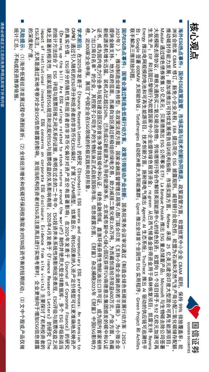 海外ESG热点事件:国外ESG政策监管、市场实践与技术创新协同推进。政策监管方面,欧盟放宽中小企业 CBAM 规则,保持 99% 排放覆盖率;欧洲议会批准 CBAM 修订,豁免小企业关税;EBA 提出简化 ESG 披露规则,减轻银行合规负担;欧盟为石油和天然气生产商分配二氧化碳储存配额,推动碳封存能力发展;新加坡推出可持续发展报告培训机构指南。市场实践方面,ReNew 承诺 25 亿美元建设印度大型混合可再生能源项目;Masdar 通过绿色债券筹集 10 亿美元;贝莱德推出 ESG 公用事业 ETF;La Banque Postale 推出 ESG 重点储蓄产品;Microsoft 与生物碳去除公司签署大规模碳去除协议;摩根大通购买二氧化碳去除物;劳埃德银行等合作解锁英国能源中心的绿色投资;欧盟向 15 个项目授予 9.92 亿欧元加速可再生氢生产;EIF 和法国巴黎银行为欧盟国家中小企业提供绿色租赁资金;re.green 从巴西气候基金获得资金用于森林恢复项目;凯雷支持 Revera Energy 推出电网规模的电池和可再生能源项目。技术创新方面,施耐德电气推出 Agentic AI 生态系统;TrusTrace 推出 AI 驱动的供应链可追溯性平台;Google 签署 600MW 太阳能协议;TotalEnergies 启动欧洲最大太阳能集群;Gprnt 推出全球首个全国性 ESG 实用程序;Green Project 和 Achilles 联手解决三维排放问题。