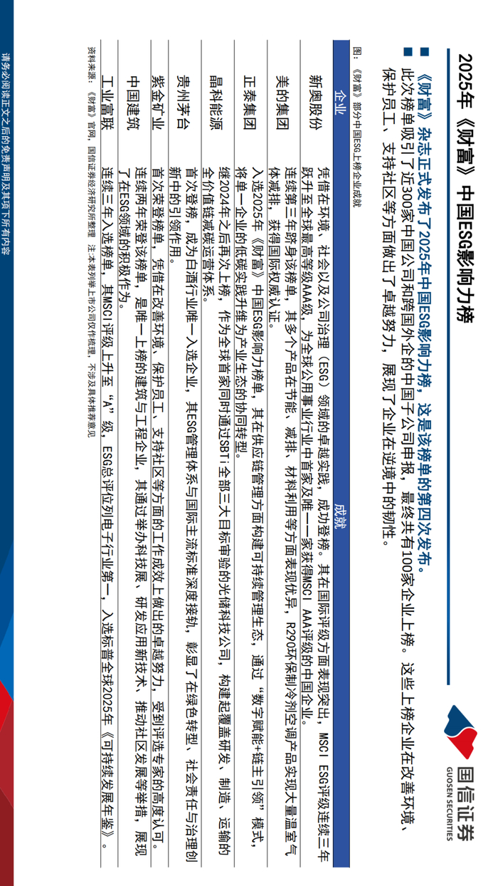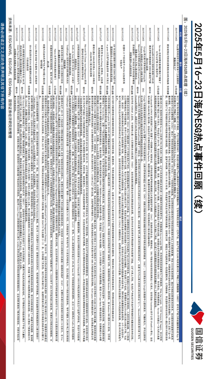 国内ESG热点事件:国常会通过制造业低碳行动方案,政策引领驱动产业创新。国务院常务会议审议通过《制造业绿色低碳发展行动方案(2025-2027年)》,推动制造业绿色转型;在政策法规方面,国家金融监督管理总局等八部门联合印发《支持小微企业融资的若干措施》,为小微企业提供金融支持。地方政府层面,西藏自治区通过积极组织绿电交易,助力减排二氧化碳2.06万吨,为西藏创造经济效益600万元。产业方面,西藏新能源装机增长迅猛,装机占比超过50%,已形成以新能源为主导的能源体系;北京城市副中心绿心园区获得TÜV南德意志集团颁发的碳中和认证证书,成为国内电力行业参与规划建设园区的首张净零排放碳中和认证。绿色金融领域,嘉澳环保获得生物航油出口许可证,成为国内首家被纳入“出口商白名单”的企业,其控股子公司生产的生物航油正式启航国际市场。信息披露方面,《财富》杂志揭晓2025年《财富》中国ESG影响力榜,近300家企业申报,展现了中国企业在ESG领域的积极实践和良好形象。