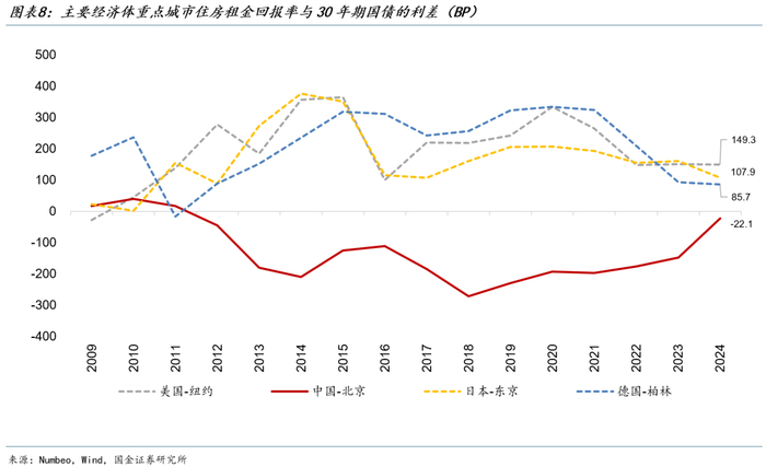 从海外经验看,考虑维修和折旧的成本后,纽约、东京、柏林等国际一线城市的住宅租金回报率长期高于30年国债收益率80BP以上,目前我国距离这一水平仍有30BP以上的差距。考虑到年内长债利率的下行空间有限,房地产市场企稳对应的百城租金回报率至少应该在2.5%以上。