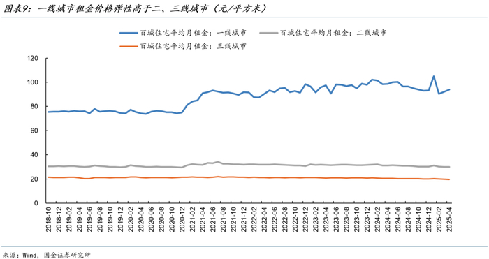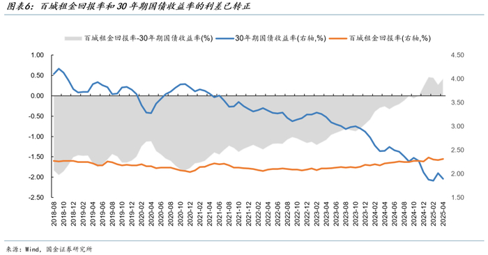 2025年4月,百城租金回报率为2.31%,与30年期国债收益率的利差由2024年初的-58BP快速回升至42BP,表明房地产的估值压力正在被消化,房地产作为投资品的吸引力也在提高。