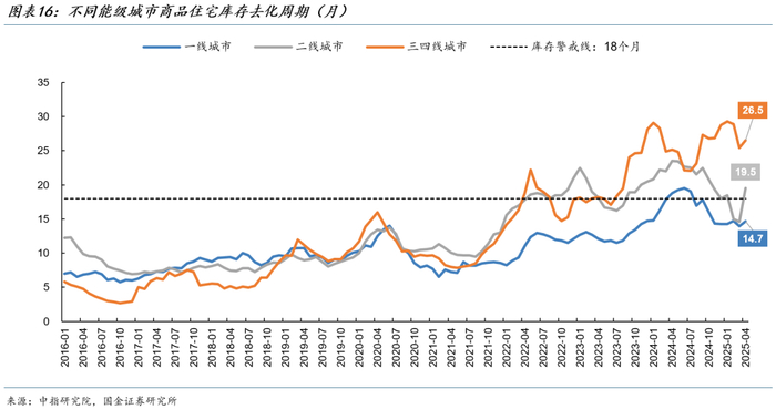一线城市库存去化压力相对较小,二线城市商品住宅库存明显分化。4月一线城市的商品住宅库存去化周期约为14.7个月,二线城市商品住宅库存的去化周期快速回升至19.5个月,较3月增加4.9个月。三四线城市库存积压较多。4月三四线城市商品住宅库存去化周期为26.5个月,较此前高点下降2.8个月。
