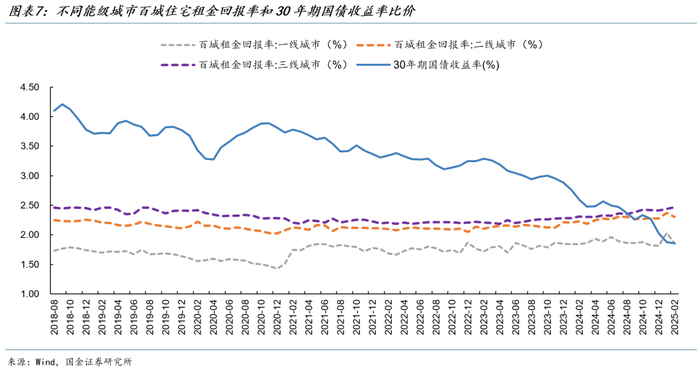 一线城市租金回报率和30年期国债收益率由倒挂转为基本持平。截至2025年4月,一线城市住宅租金平均回报率为1.96%,30年期国债收益率为1.89%,二者的利差由2024年初的-92BP快速回升至7BP。