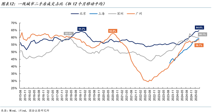 一线城市房地产市场基本具备企稳的条件,二三线样本城市的二手房成交占比较成熟市场仍有一定差距。2025年1-4月,一线城市二手房成交占比为63.7%,较2024年全年上升4.5个百分点。样本二、三线城市二手房成交占比分别为58.8%、50.6%,较2024年全年分别提高8.9、6.3个百分点。