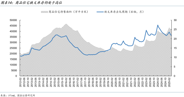 广义库存是指已开工可供销售的商品房屋建筑面积。2024年9月政治局会议提出“促进房地产市场止跌回稳”以来,商品住宅销售面积明显回升,新开工面积延续回落,广义库存去化周期明显缩短。4月商品住宅广义库存约为13.7亿平方米,较2024年初去化3.7亿平方米,相当于2010年4月的水平。库存去化周期已降至20.4个月,较2024年9月缩短3.1个月。