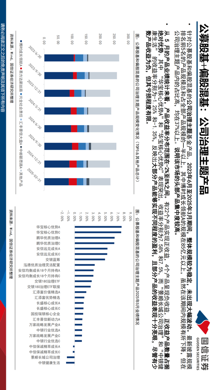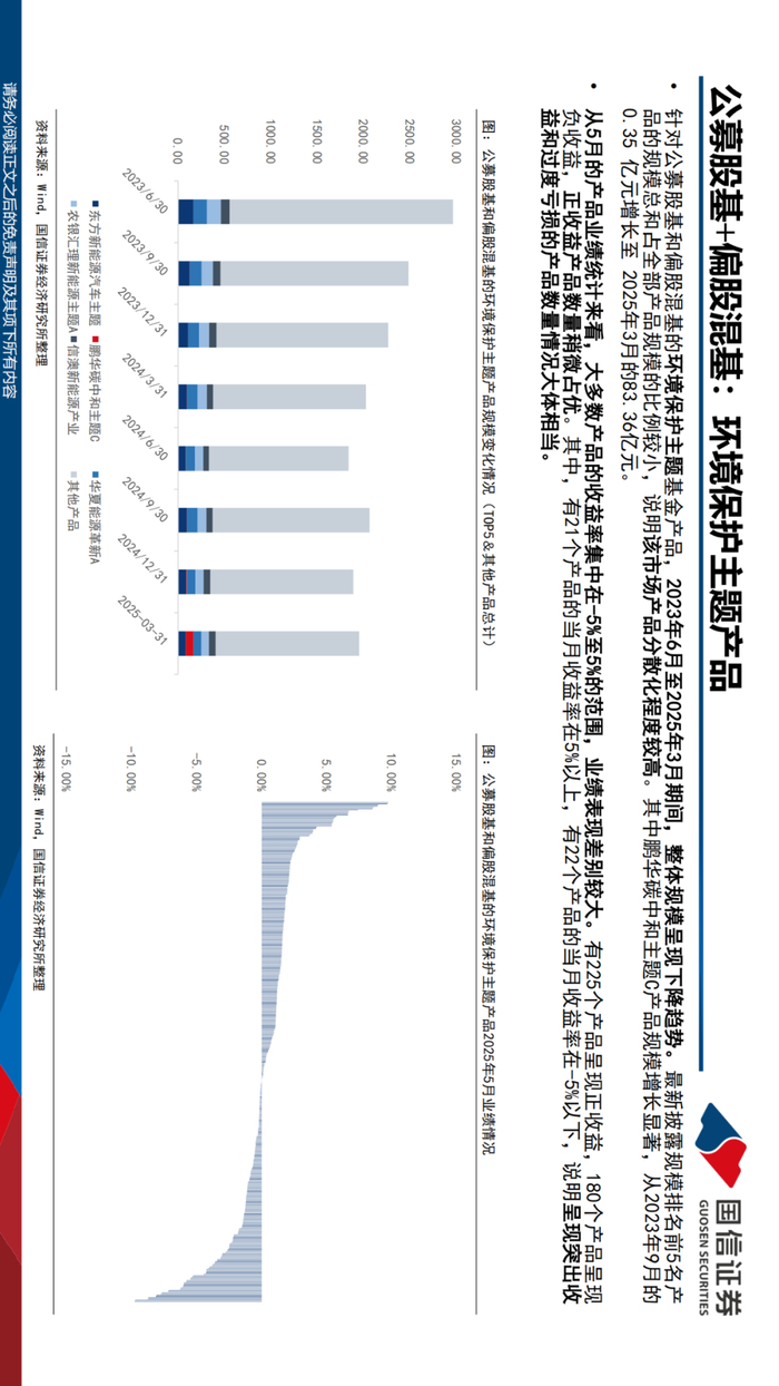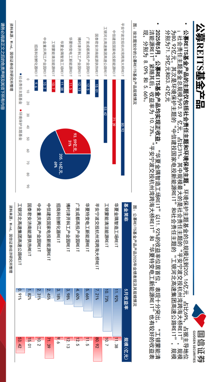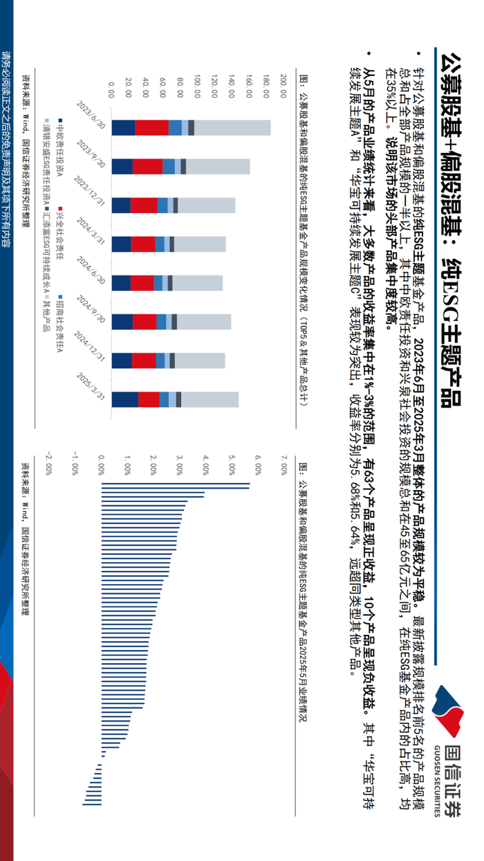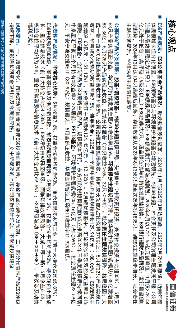 公募ESG产品分类跟踪:股基+偏股混基:纯ESG主题规模平稳,头部集中(中欧责任投资、兴泉社会投资占比超35%);5月又63只产品实现正收益,华宝可持续发展主题A/C收益率超5%。环境保护主题规模下滑,鹏华碳中和主题C规模从0.35亿激增至83.36亿;5月225只产品实现正收益,业绩分化显著(21只收益>5%,22只<-5%)。社会责任主题规模缓降,格局稳固;大成一带一路A/C及融通新消费收益率超5%。公司治理主题规模稳定,博时成长领航A占比保持37%以上;5月有22只产品实现正收益,华宝核心优势A/C收益率超7.5%。债券基金:2025年一季度环境保护主题规模增长129.94亿元(+88.06%),ESG策略主题增89.63亿元(+51.13%),社会责任主题缩水124.45亿元(-12.22%)。5月绩优债基中,汇添富添添乐双盈A收益率0.61%领跑。FOF基金:全部产品为ESG策略主题产品,规模整体下行,东方红欣悦稳健配置C成立推高2024年三季度规模后持续回落;中泰星汇平衡三个月持有C收益率2.27%居前。REITS基金:环境保护主题规模205.16亿元(占比69%),社会责任主题93.59亿元;平安宁波交投REIT(80.92亿)规模最大,5月全部正收益,华夏金隅智造工场REIT收益率11.92%最优。