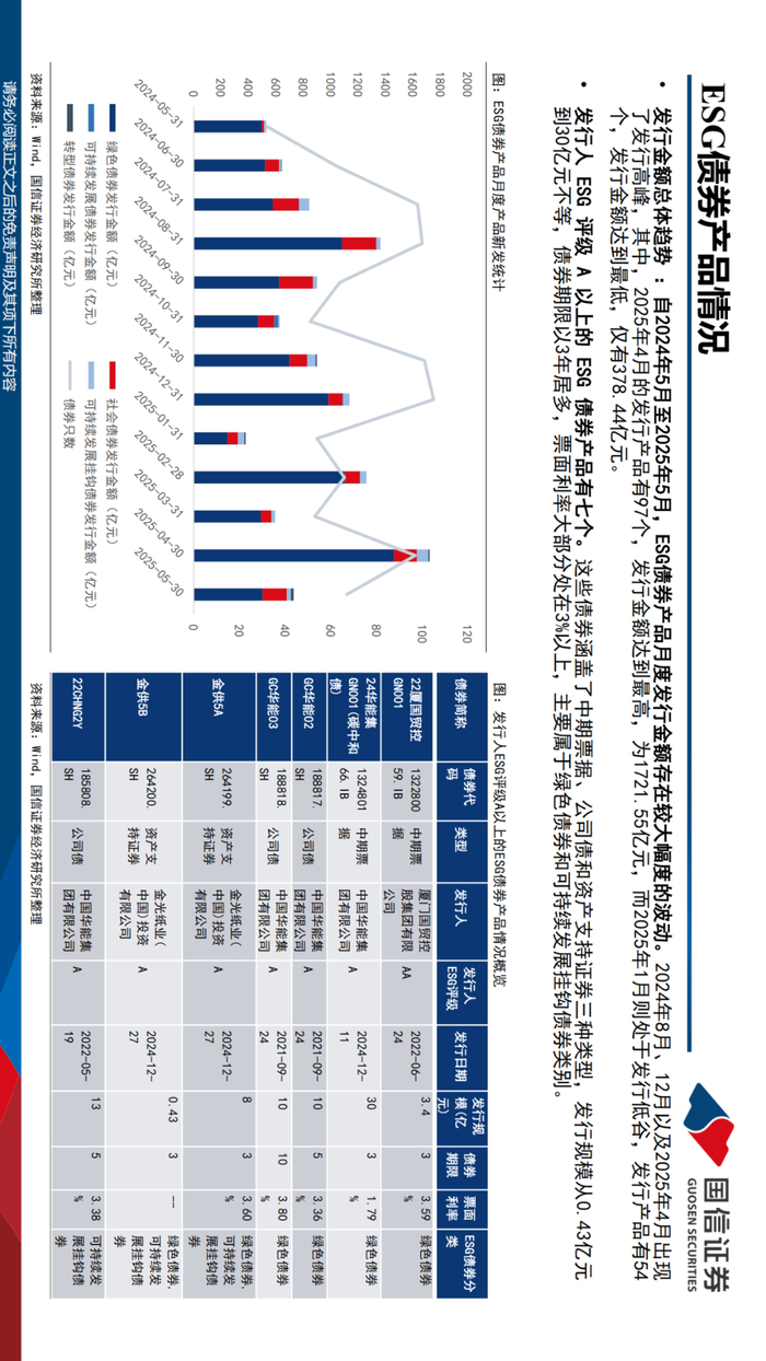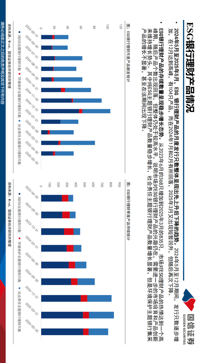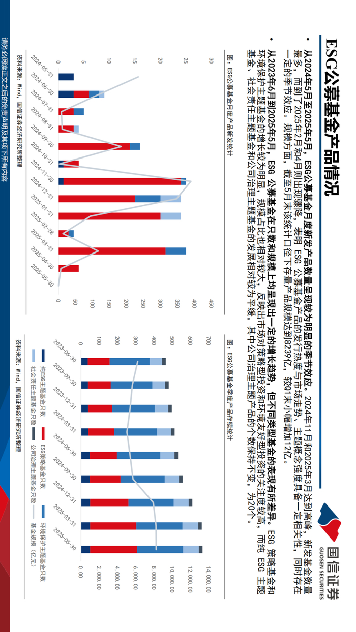 ESG产品概况:ESG公募基金产品情况:新发数量波动显著,2024年11月与2025年3月达高峰,2025年2月及4月骤降;近两年整体规模增长但分化明显,ESG策略基金与环境保护主题基金增速领先,纯ESG主题、社会责任及公司治理主题发展平缓(公司治理产品数量稳定为20只)。ESG债券产品情况:ESG债券发行金额波动剧烈,2025年4月以1721.55亿元创峰值,1月仅378.44亿元处于低谷;高评级(A级及以上)ESG债券共7只,涵盖绿色债与可持续发展挂钩债。ESG银行理财产品情况:发行量呈倒U型趋势,2024年12月达104只高峰后回落;存续数量从2023年6月368只增至2025年3月835只,纯ESG主题稳步增长,社会责任主题显著提升,环境保护主题表现疲软。
