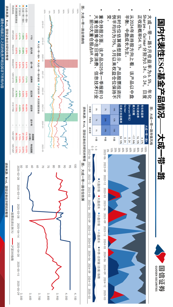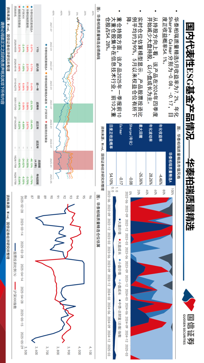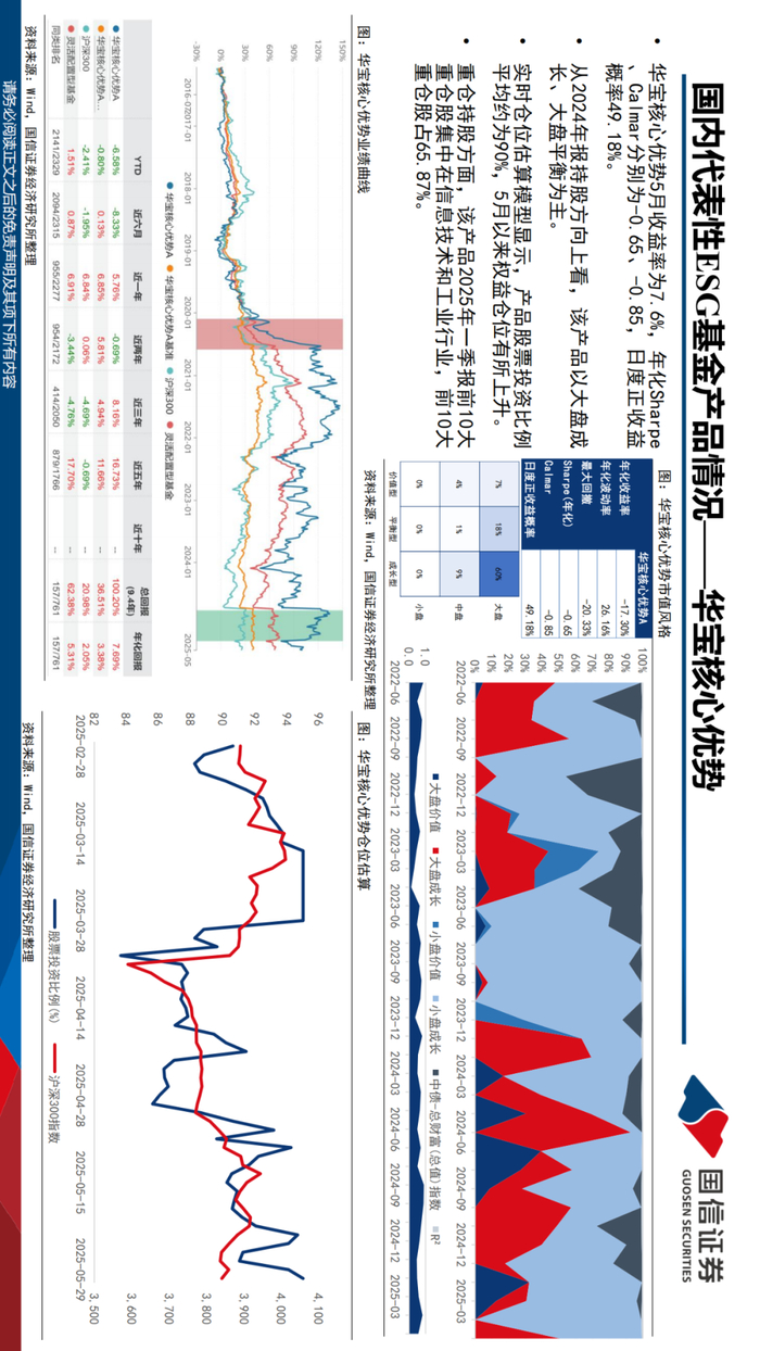 代表性产品情况:华宝核心优势:5月收益7.6%,权益仓位平均约为90%,重仓信息技术与工业(前十大持仓占比65.87%);ESG评级稳定BBB级,暴露碳排放及供应链风险。华泰柏瑞质量精选:5月收益7.2%,权益仓位平均约为90%,持仓转向小盘成长,重仓信息技术(前十大持仓占比54.28%);ESG评级由AA降至BB级,面临碳排放等风险。大成一带一路:5月收益6.5%,权益仓位平均约为75%,重仓日常消费与信息技术(前十大持仓占比69.6%);ESG评级波动(BB→CCC→BB),争议涉及动物福利风险。