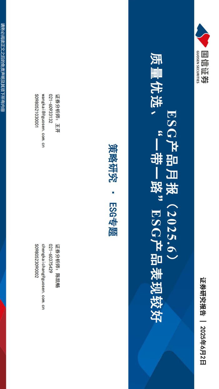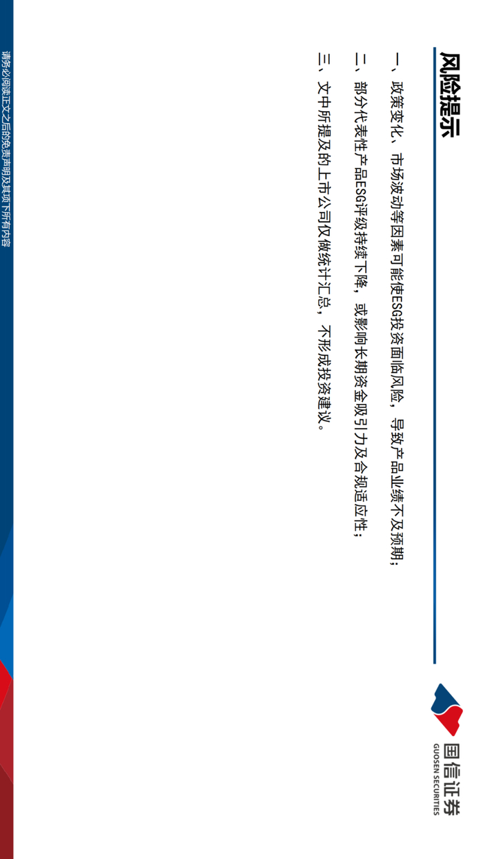 风险提示:一、政策变化、市场波动等因素可能使ESG投资面临风险,导致产品业绩不及预期;二、部分代表性产品ESG评级持续下降,或影响长期资金吸引力及合规适应性;三、文中所提及的上市公司仅做统计汇总,不形成投资建议。