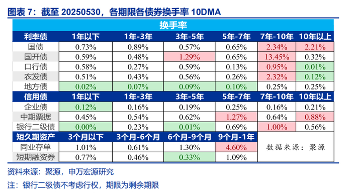 等待长端收益率的下行契机。6-7 月份可能仍处于抢出口外需偏强但内需偏弱的环境,对债券市场仍有利。10 年国债下行或需要存单利率下行来推动,长端利率的下行需要一定契机,在央行恢复国债买入前均可能处于做多左侧。