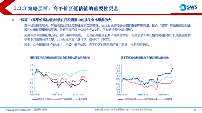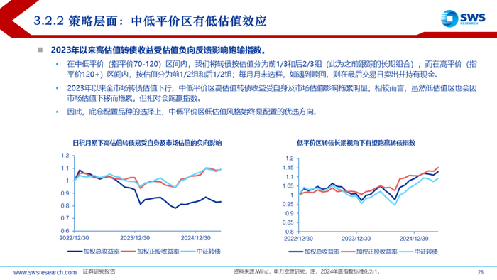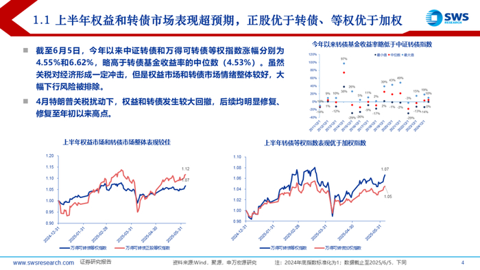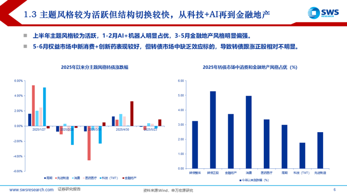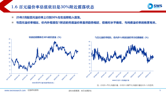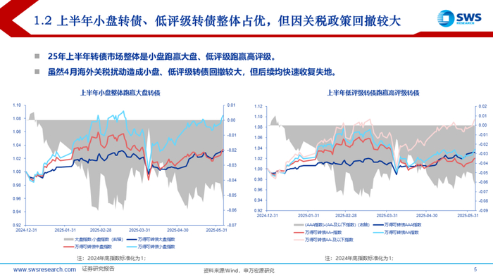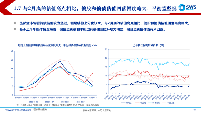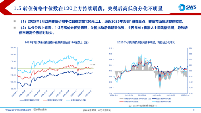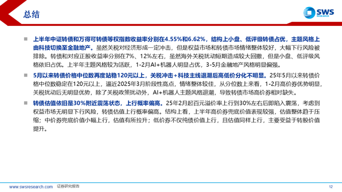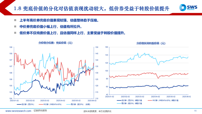 上半年中证转债和万得可转债等权指数收益率分别在4.55%和6.62%,结构上小盘、低评级转债占优,主题风格上由科技切换至金融地产。5月以来转债价格中位数再度站稳120元以上,关税冲击+科技主线退潮后高低价分化不明显。转债估值依旧是30%附近震荡状态,结构上看,上半年高价券兜底价值表现较强,估值整体趋于压缩;中价券兜底价值小幅上行,估值有所拉升;低价券不仅纯债价值上行,且估值同样上行,主要受益于转股价值提升。