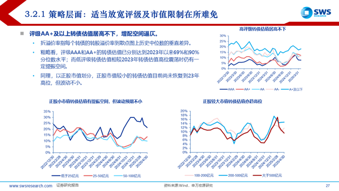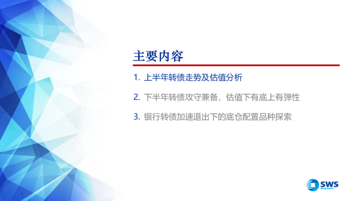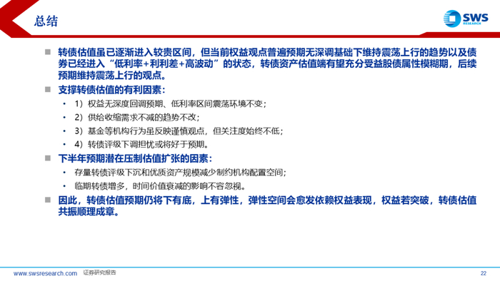 1)权益无深度回调预期、低利率区间震荡环境不变;2)供给收缩需求不减的趋势不改;3)基金等机构行为虽反映谨慎观点,但关注度始终不低;4)转债评级下调担忧或将好于预期。下半年预期潜在压制估值扩张的因素:1)存量转债评级下沉和优质资产规模减少制约机构配置空间;2)临期转债增多,时间价值衰减的影响不容忽视。因此,转债估值预期仍将下有底,上有弹性,弹性空间会愈发依赖权益表现,权益若突破,转债估值共振顺理成章。