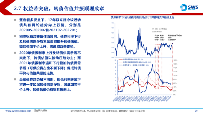 转债估值虽已逐渐进入较贵区间,但当前权益观点普遍预期无深调基础下维持震荡上行的趋势以及债券已经进入“低利率+利利差+高波动”的状态,转债资产估值端有望充分受益股债属性模糊期,后续预期维持震荡上行的观点。