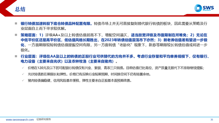 银行转债加速转股下底仓转债品种配置有限。转债市场上并无可直接复刻替代银行转债的板块,因此需要从策略及行业层面自上而下寻求较优解。策略层面:1)评级AA+及以上转债估值居高不下,增配空间逼仄,适当放宽评级及市值限制在所难免;2)无论在中低平价区还是高平价区,低估值风格长期胜出,在2023年转债估值震荡市下亦然;3)新老券估值差有望进一步极化,一方面期限较短转债估值提振空间有限,另一方面转债“老龄化”现象下,新券等期限较长转债估值或将进一步极化。行业层面:评级在AA及以上的转债的正股行业可供替代的方向并不多。考虑行业存量和平均单券规模下,仅有银行、电力设备(主要来自光伏)以及农林牧渔(主要来自猪肉)。