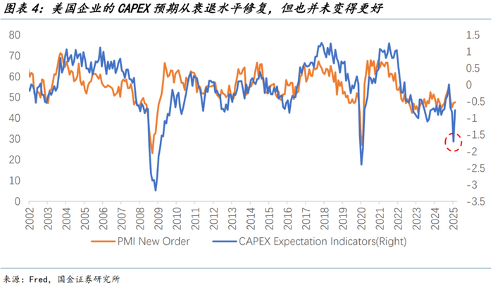关税缓和后,此前进入衰退水平的美国企业CAPEX支出预期有所回暖,但也并未变得更好,这一指标也基本回到去年9月的水平。