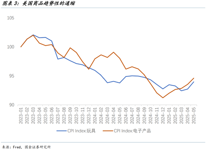 除此之外,不可忽视的是美国众多商品享受着技术进步带来的长周期趋势性价格下降,比如玩具和电子,这也会对冲关税一次性因素的跳升。