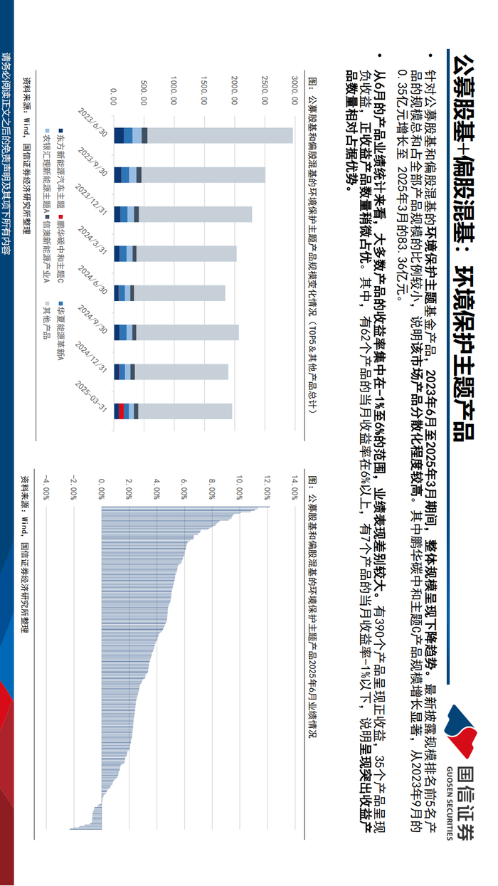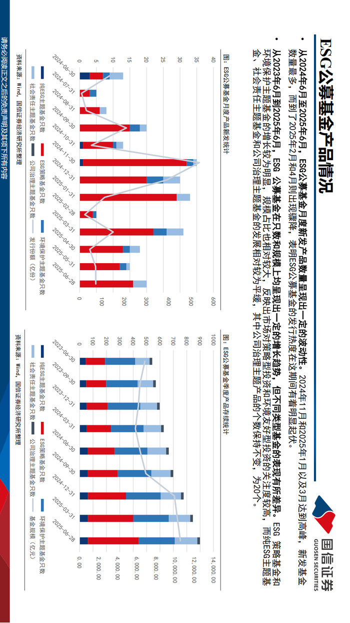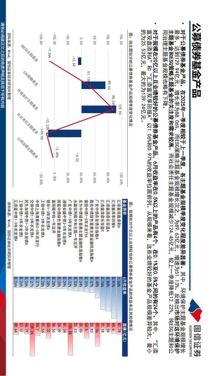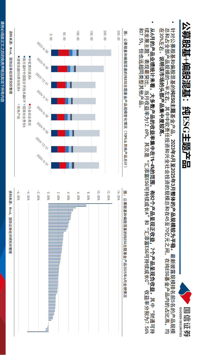 公募ESG产品分类跟踪:股基+偏股混基:纯ESG主题规模平稳,头部集中(中欧责任投资、兴全社会投资占比约35%);6月有82只产品实现正收益,“财通可持续发展主题”当月收益率为12.69% 。环境保护主题规模呈下滑趋势,鹏华碳中和主题C规模从0.35亿激增至83.36亿;6月390只产品实现正收益,业绩分化显著(62只收益>6%,7只<-1%)。社会责任主题规模缓降,格局稳固;产品收益率超15%的产品为“博时回报严选A”和“博时回报严选C”。公司治理主题规模稳定,汇添富价值精选A占比保持35%以上;6月有24只产品实现正收益,华宝核心优势A/C收益率超17%。债券基金:2025年一季度环境保护主题规模增长129.94亿元(+88.06%),ESG策略主题增89.63亿元(+51.13%),社会责任主题缩水124.45亿元(-12.22%)。6月绩优债基中,汇添富双鑫添利A收益率1.06%领跑。FOF基金:全部产品为ESG策略主题产品,规模整体下行,东方红欣悦稳健配置C成立推高2024年三季度规模后持续回落;汇添富核心优选六个月持有A收益率为4.58%居前。REITS基金:环境保护主题规模218.83亿元(占比70%),社会责任主题93.59亿元(占比30%);6月有8个产品实现正收益,4个产品呈现负收益,“国泰君安济南能源供热REIT”以12.1%的收益率位居首位。